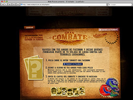 A través de un juego en el que se debe ir peleando con diferentes luchadores, el usuario puede elegir a algunos de sus amigos para luchar contra cada uno de ellos y progresivamente ir montando un cartel de lucha que podrá enviar a sus amigos. Además, desde el mismo site, podrá publicar su opinión o recomendación en su muro de Facebook, generando una viralidad dentro de la propia red. Las diferentes peleas se desarrollan a medida que se navega por el site, garantizando así una total integración de navegación en la web con la experiencia de Facebook. La agencia interactiva OneBigRobot ha desarrollado este proyecto con el objetivo de integrar las redes sociales dentro de la estrategia de marketing interactivo para el estreno de la película. El film, que se estrena el 20 de febrero y está distribuido por Universal Pictures y Wide Pictures, ha ganado dos Globos de Oro y tiene dos nominaciones a los Oscar. www.elluchadorlapelicula.es | |||