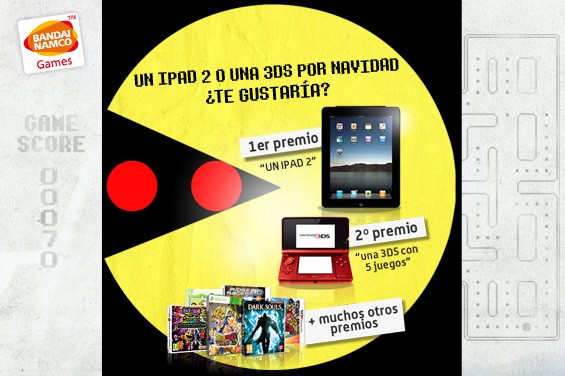 Desde ya, y hasta el 15 de enero, los visitantes de la web oficial pueden entrar en el sorteo con tan sólo iniciar sesión y responder a un puñado de sencillas preguntas acerca del catálogo de NAMCO BANDAI Games. ¿Crees que conoces nuestros juegos? Pronto lo veremos… El flamante iPad 2 del primer premio será la envidia de todos tus amigos que no hayan tenido uno como regalo en Navidad. Pero eso no es todo, un afortunado se llevará una Nintendo 3DS y cinco impresionantes juegos del catálogo de NAMCO BANDAI. Pero la cosa no termina ahí, ya que tenemos premios para otros más de 20 ganadores, entre los que se incluyen también packs de juegos con ediciones limitadas y elementos exclusivos de franquicias tan conocidas como Ace Combat, Dragon Ball Z o PAC-MAN. Pásate ya por www.namcobandaigames.eu, pincha en la pestaña de concursos e inscríbete para tener la oportunidad de que un rayo de luz de NAMCO BANDAI Games ilumine tu mes de enero. | |||