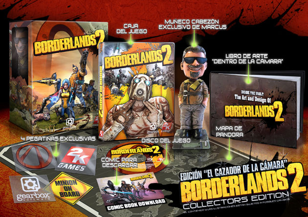 · La edición “El Cazador de la cámara: Collector’s Edition” de Borderlands 2 (con un precio recomendado de 69,99€ en PC y 89,99€ en consolas), incluye una copia de Borderlands 2, un muñeco cabezón exclusivo de Marcus Kincaid, el libro de arte "Dentro de la Cámara", un set de pegatinas, el mapa de Pandora, un cómic digital para descargar y contenido extra descargable para el juego.Añadir Anotación