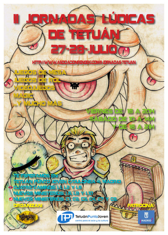 Viernes: 17:00: Torneo de Magic 18:00: Torneo de Softcombat Sábado: Torneos de videojuegos (todo el día) Partidas de Rol (todo el día) 12:00: Taller de Hamas 17:00: Concurso de Cosplay 18:00: Gincana 19:30: Frikitest Ademas durante los 2 días es posible alquilar diversos juegos de mesa, así como Freeplays de videojuegos. Estas jornadas se celebraran los días 27 y 28 de Julio. Los horarios son de 16 a 20 horas los viernes y de 11 a 14 y de 16 a 21 horas los sábados. Aun están por confirmar varias actividades y los horarios. Puedes estar al tanto de las novedades en nuestro blog o en Twitter a través de nuestras cuentas en Tuenti, Facebook, Twitter y Google+, ademas de por el hastag #JornadasTetuan en Twitter Fuente: http://www.asociacionrengeki.com/ii-jornadas-tetuan/ | |||