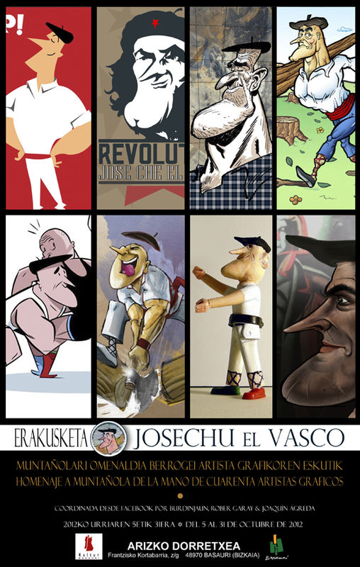 Nacido en Barcelona en 1914 en el seno de una familia con tradición en el campo editorial, Muntañola empezó su prolífica carrera profesional a mediados de los años 30 en publicaciones catalanas como El Be Negre, L’Esquitx, Xut! y En Patufet. A principios de los años 40 se asoció con Francisco Rovira-Beleta para crear la productora de animación CEIDA, con la que realizó varios cortos de dibujos animados protagonizados por el "Faquir González", en colaboración con Josep Escobar. También en esa época dirigió la revista Atalaya, hasta el año 1947, y en 1955 puso en marcha la revista de humor Locus, que apenas duró dos años tras tener tropiezos con la censura. En los años 40 trabajó para el entonces célebre TBO y creó personajes como "Josechu el vasco", "Angelina y Cristobalito" y "Doña Exagerancia". En 1944 empezó su colaboración con "El Correo Catalán" que duró hasta la década de los ochenta, en 1945 comenzó a hacerlo para "El Mundo Deportivo", y en 1962 se incorporó a La Vanguardia donde publicó una viñeta diaria hasta 1984. El mes de abril, un grupo de dibujantes vascos emprendió a través de Facebook el proyecto de conmemorar a Muntañola a través de su personaje “Josechu el vasco”. Y funcionó. Mediante sus dibujos han tratado de ofrecer su particular visión de un personaje que para ellos fue el precursor de un mundo que les apasiona, el de los superhéroes. La respuesta al llamamiento superó las previsiones. La variedad de los trabajos y su calidad nos han animado a programar una muestra con una selección de obras que tendrá lugar del 5 al 31 de octubre en Arizko Dorretxea de Basauri. El proyecto de exposición nace con el mismo objetivo con el que vio la luz la iniciativa, homenajear a Muntañola a través de su personaje. El homenaje recoge desde una fusión entre el Mayor Grubert, creación de Giraud, y Josechu, hasta un collage basado en la tradición costumbrista. Desde una mezcla entre el personaje y su creador hasta varios montajes fotográficos. En color y en blanco y negro. Surrealistas y fieles. Trazos de ilusión y respeto en honor a dos figuras inspiradoras. A Josechu y a Muntañola. | |||
